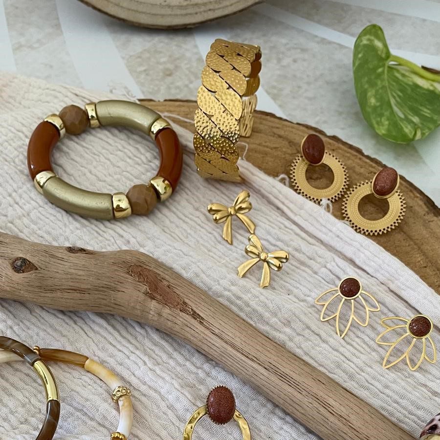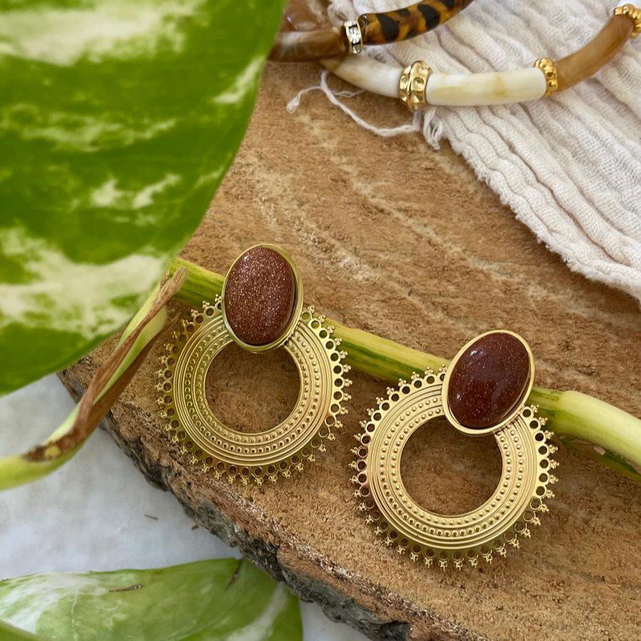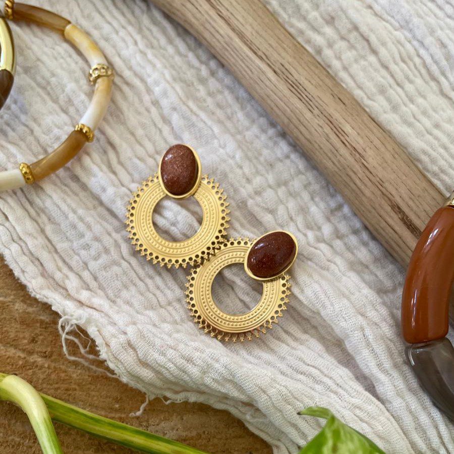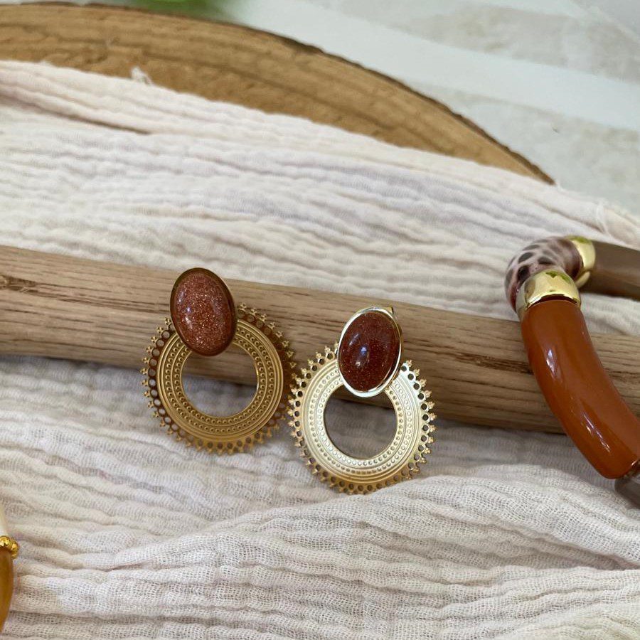 Boucles d’oreilles rond doré ajouré et pierre marron pailleté