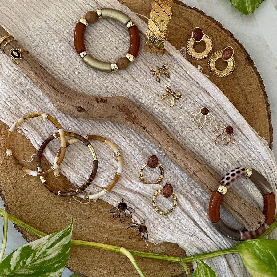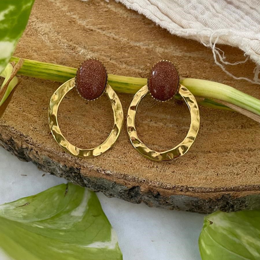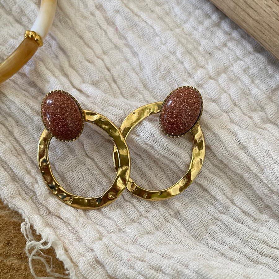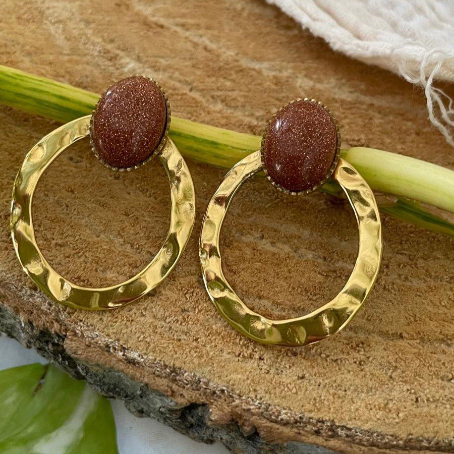 Boucles d’oreilles rond martelé et pierre marron pailleté