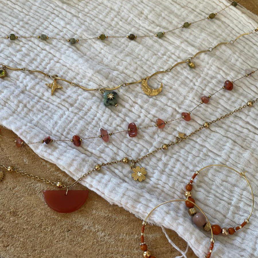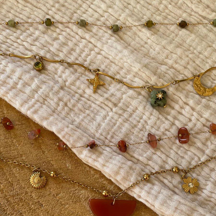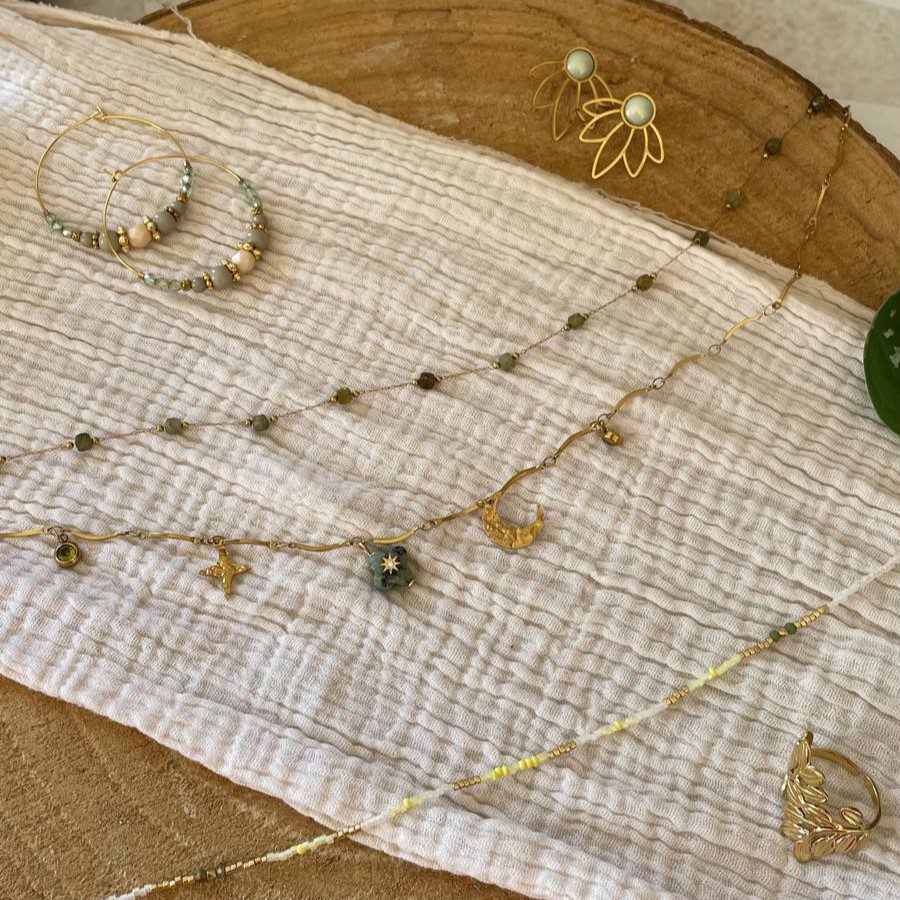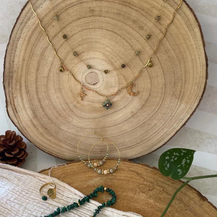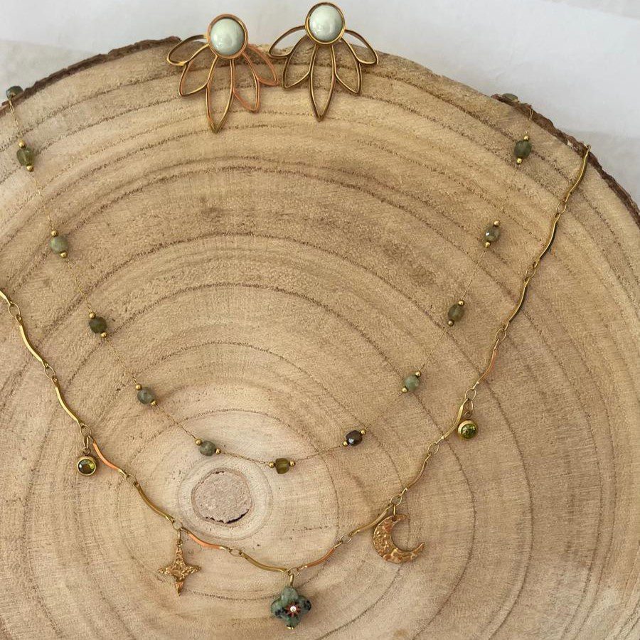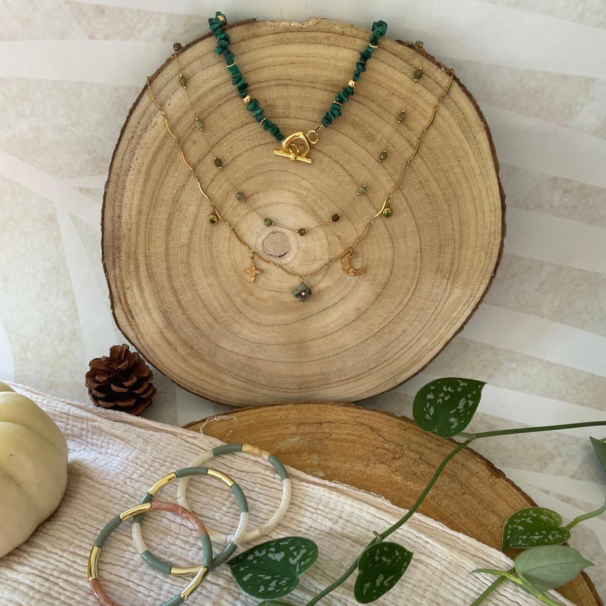 Description : Découvrez notre collier deux rangs vert et doré, un bijou sophistiqué qui allie naturel et glamour. Ce collier est conçu pour sublimer vos tenues, qu’elles soient décontractées ou habillées. Parfait pour les amateurs de bijoux uniques et pleins de caractère !