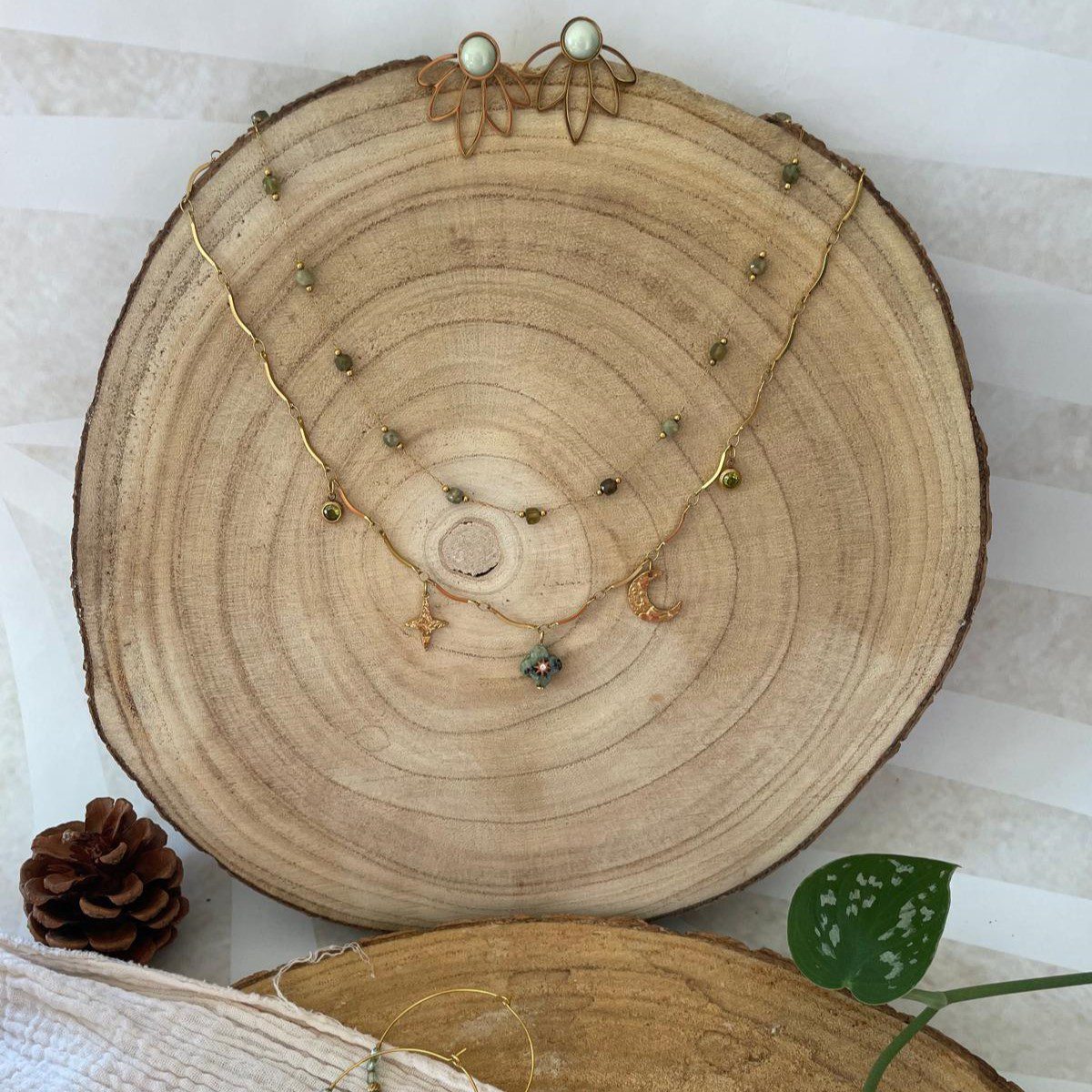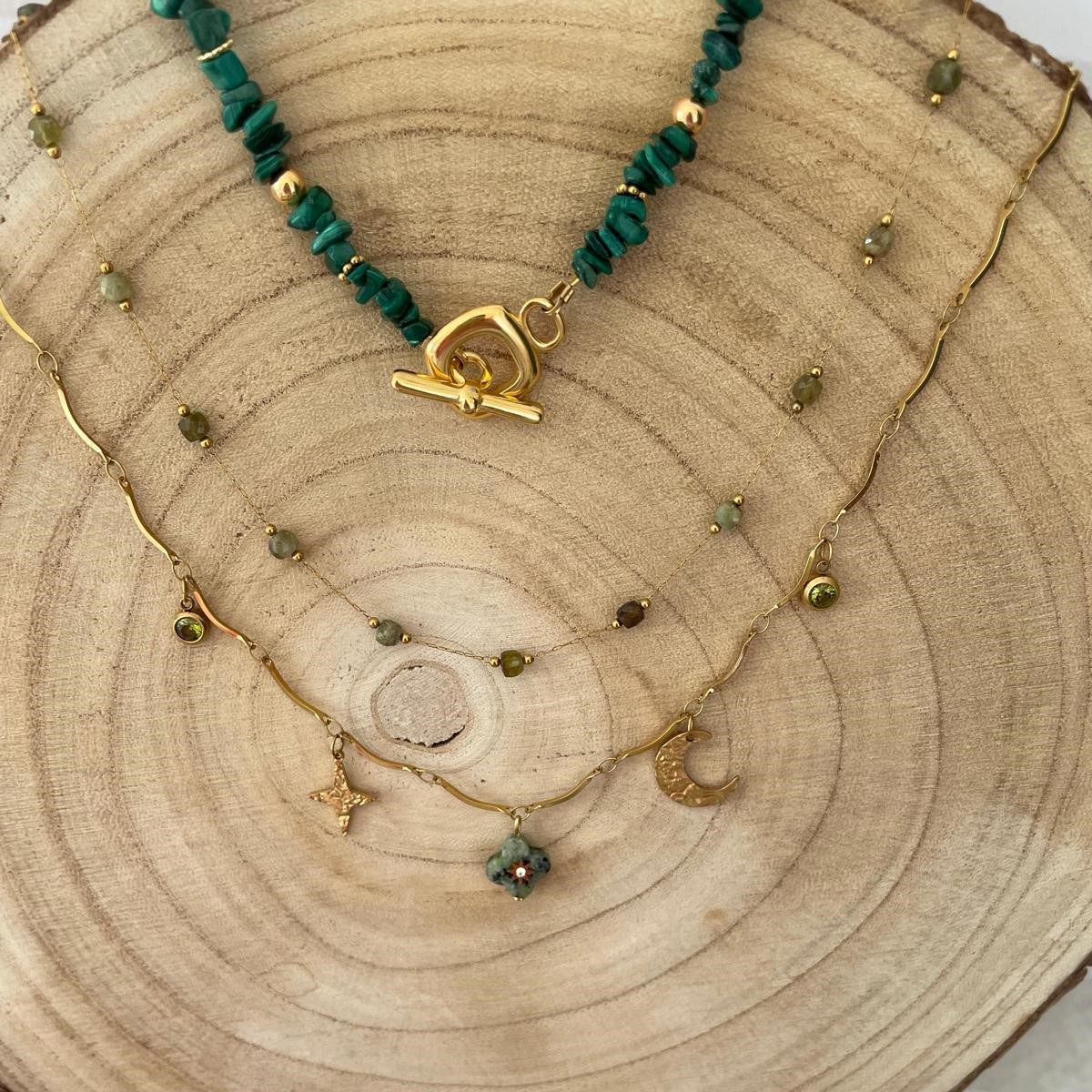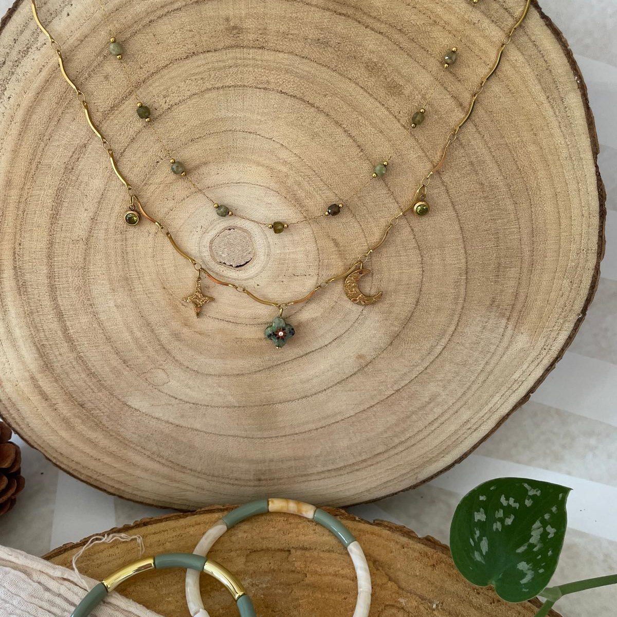 🌿✨ Collier Deux Rangs Vert et Doré – Élégance Naturelle et Raffinée ✨🌿