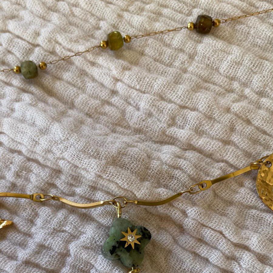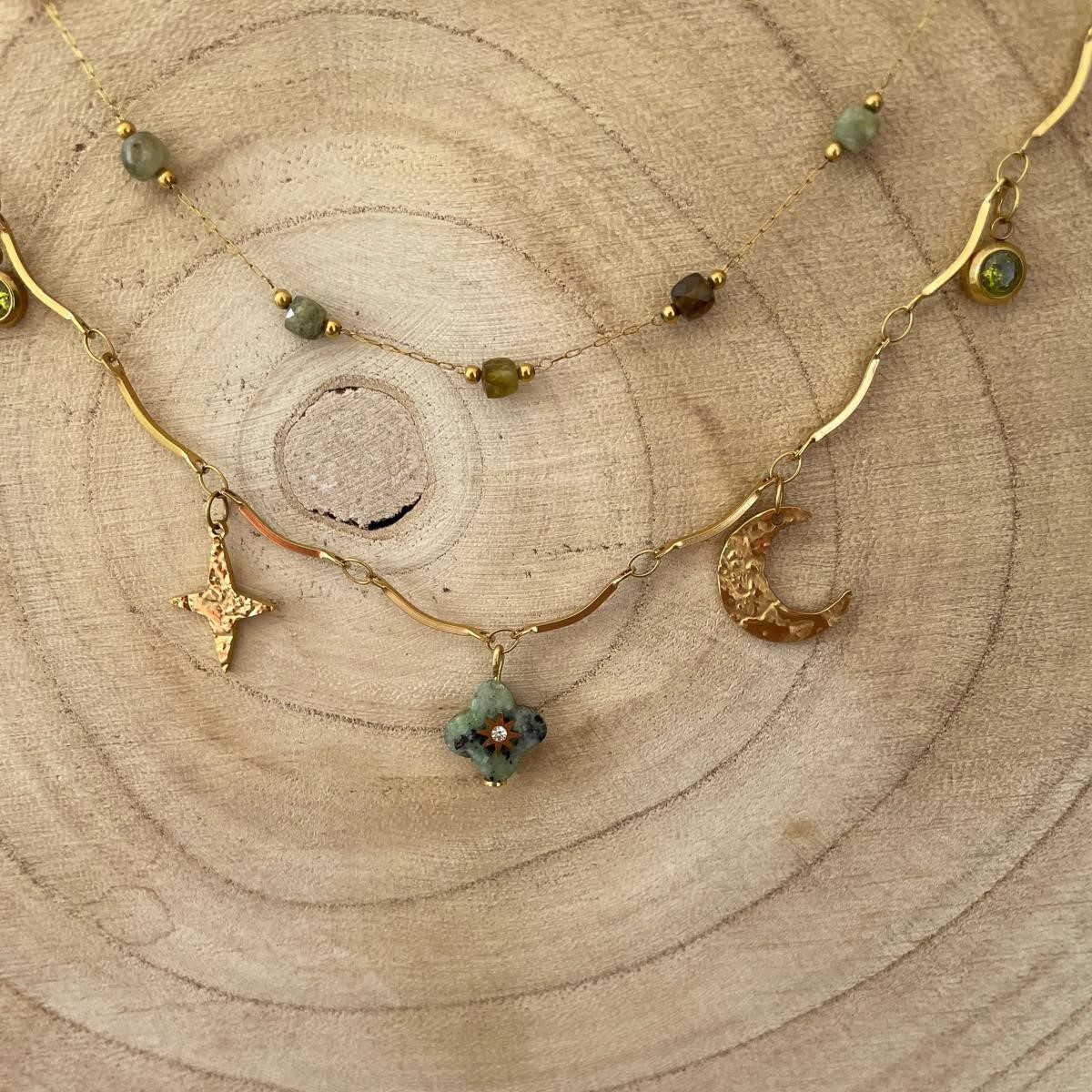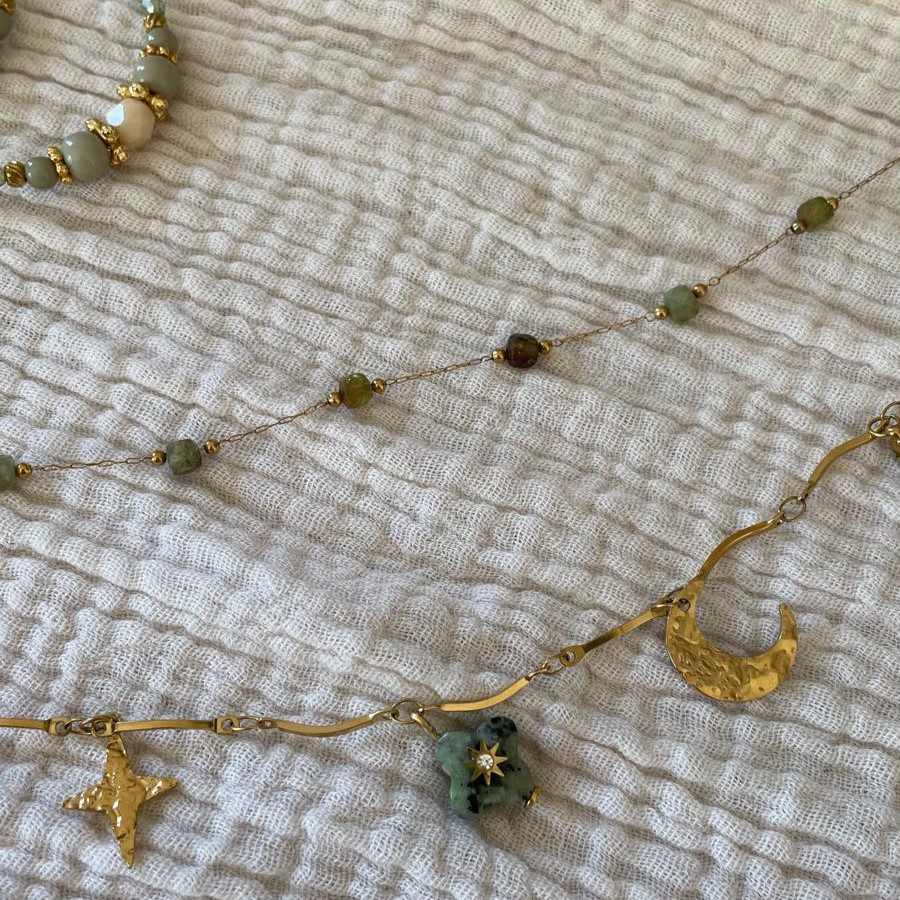 Collier 2 rangs chaîne perles vertes et chaîne breloques